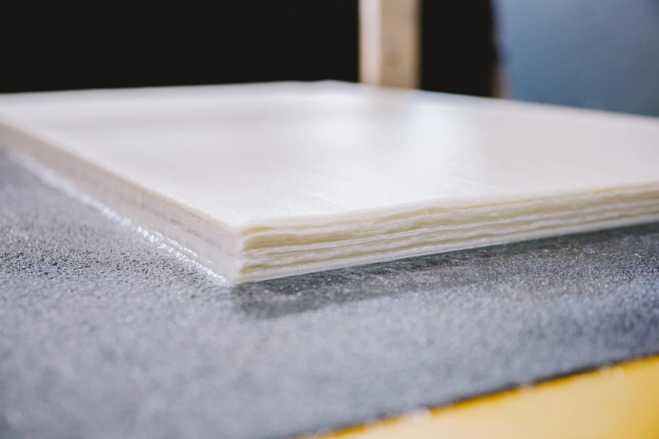 西田さんのところでは4人同時に紙を漉くことができる設備があり量産できるのが強み。多い時には年に2〜3万枚もの紙を漉くという。