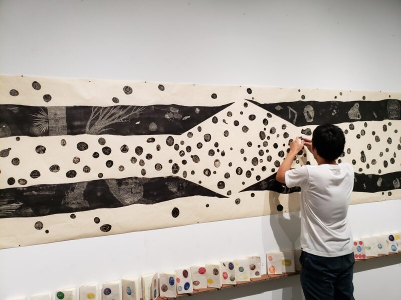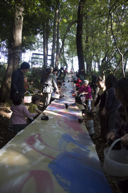 公園内にある町田市立国際版画美術館のアーティスト・イン・レジデンスとの連帯ワークショップも行いました。 公園の整備で伐採が決まっていたエゴの木を切らずに、みんなで根から掘り出して版木にしたというプロジェクト。実はその木は、子どもたちがいつも木登りをしていた木でした。市民400人が参加するという大掛かりなもので、切り出した材に電熱ペンで絵を描いて、それを版にして刷ったものを、版画作家さんが大きな作品の中に全部貼り付けて、一つの作品として完成させました。