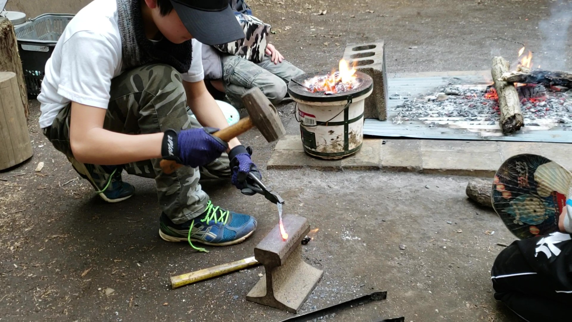 「釘ナイフは、七輪で火をおこしてそこに五寸釘を入れて真っ赤になるまで焼きます。金床の上にのせて、金槌で叩いて伸ばす。やすりで削ったあと最後に砥石で研いで、ナイフをつくります。
