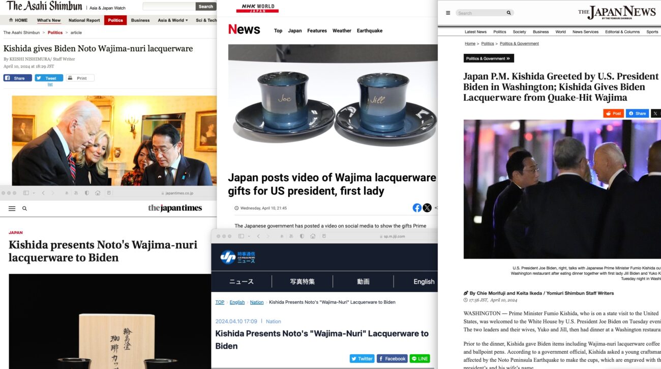 先月、日本の岸田首相が訪米した際、今年の能登半島地震からの復興を目指す輪島塗のコーヒーカップとボールペンを、バイデン大統領夫妻に贈呈したというニュースがありました。