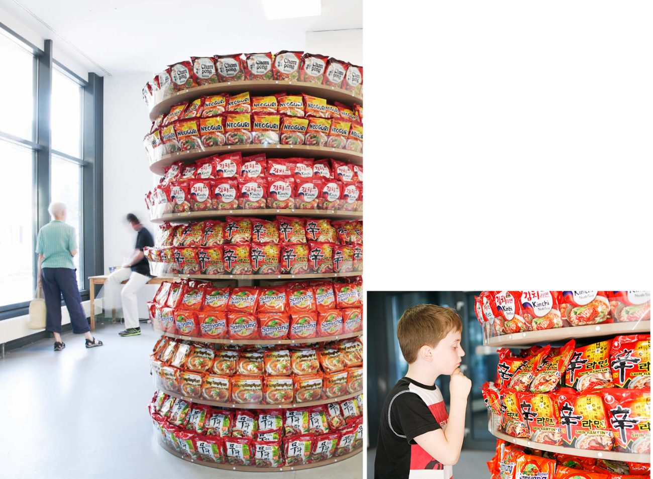 実は、初めて「映像インスタレーション」が受賞したことにたいする批判もまだあるという。しかしインスクさんは、作品のメディアに関する問題には頓着していない。アーティストとしての活動は、まず人々と「関わり」をもち対話を続けることであり、その表現として作品があり、表現に一番適したメディアをその都度選んでいるにすぎないからだ。必要であれば、2,000個のインスタント麵も1週間かけて積み上げる。