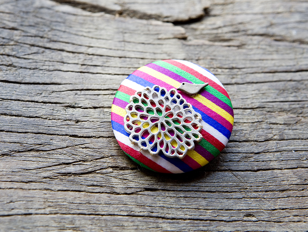 このブローチは、「セクトン」と呼ばれる韓国の伝統模様の布地を、ボタンを製造する機械で丸型に成形し、裏面にピンを付けています。同じく韓国の伝統的なモチーフである花と鳥のパーツは、材料費を安く抑えるため市場で探し回って見つけたものです。使用している布はデッドストック(売れ残り品や長期間放置されていた在庫品)を使用しています。ほかにも、夫の実家にあった1960年代の北朝鮮の布で制作したものもあります。韓国では、1990年以降、結婚式などでもハンボクを着ることが減っていったのですが、全盛期につくられた布はしっかりした素材で、レトロな雰囲気があり、制作費を抑えられます。