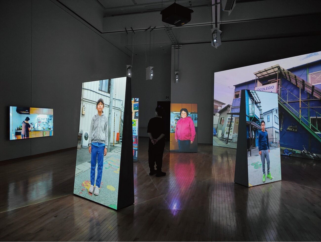 このインスタレーションは、10のスクリーンが同期する圧巻の空間。入って右の壁面にある「Side A」と呼ばれる7mのスクリーンでは、学園の子どもたちの生活を撮影した映像が映され、彼らとの対話の音声が会場内に流れている。反対側の壁の80インチモニタ「Side B」では、子どもたちの送迎から食事作り、授業まで、校長として早朝から夜まで働く女性の日常が会話とともに映し出される(音声はヘッドホンで聴ける)。この2つの大型ヴィデオ作品の間の中央スペースに、表裏2面の2mの縦型スクリーンが4台置かれ、0歳から18歳までの生徒と学園スタッフなど80〜90名のポートレイトが、一人ずつ数秒〜1分間映し出される。