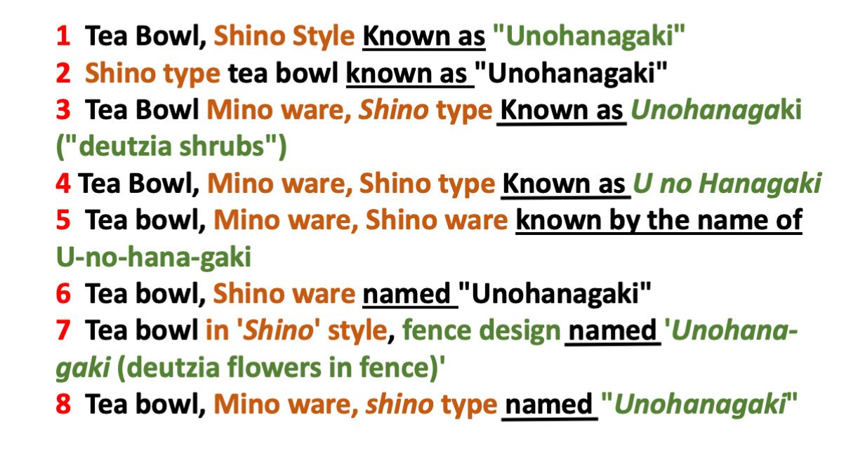 以下は、CoJのチームで調査した「志野茶碗 銘 卯花墻」の英訳語の例です。