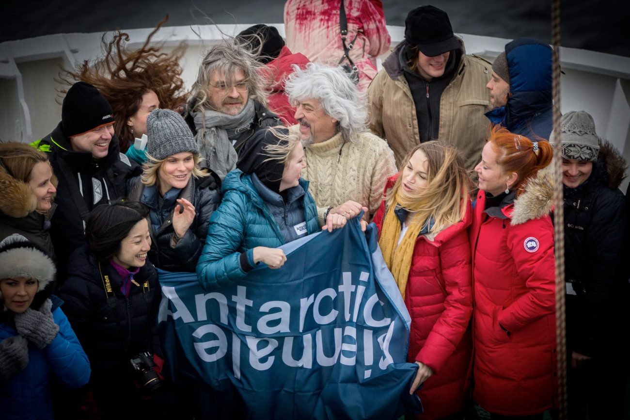 南極ビエンナーレにて、南極圏に達したことを喜ぶ人々。前列左から2番目が鴻野さん、中央がポノマリョフ