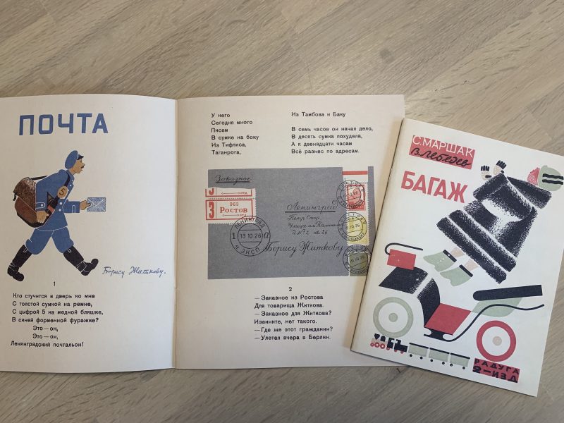 復刻されたロシア絵本、「郵便」(詩:サムイル・マリシャーク、絵:ミハイル・ツェハノフスキー、1927年初版)と「荷物」(詩:サムイル・マリシャーク、絵:ウラジミール・レーベンジェフ、1926年初版)。鴻野さんによる日本語訳を付録