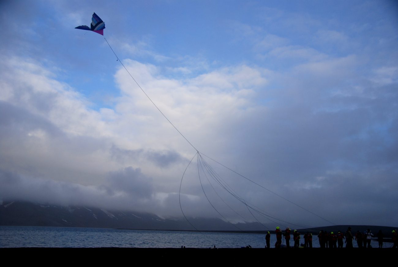五十嵐靖晃は日本やブラジルの自閉症の子供たちと藍染した糸を南極に持参して、ビエンナーレの参加者達と共に江戸組紐を組みました。そしてみんなでその紐を使って南極で凧揚げをしたのです。