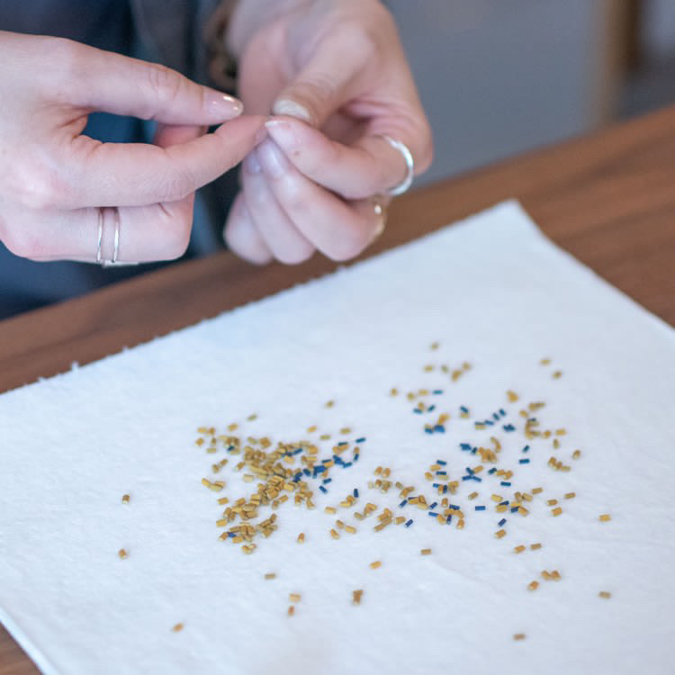 itiitiのアクセサリーも、イグサの芯がスポンジ状になっている構造を利用してつくられる。カットしたイグサの内側に糸をとおしてつなぐのだ。