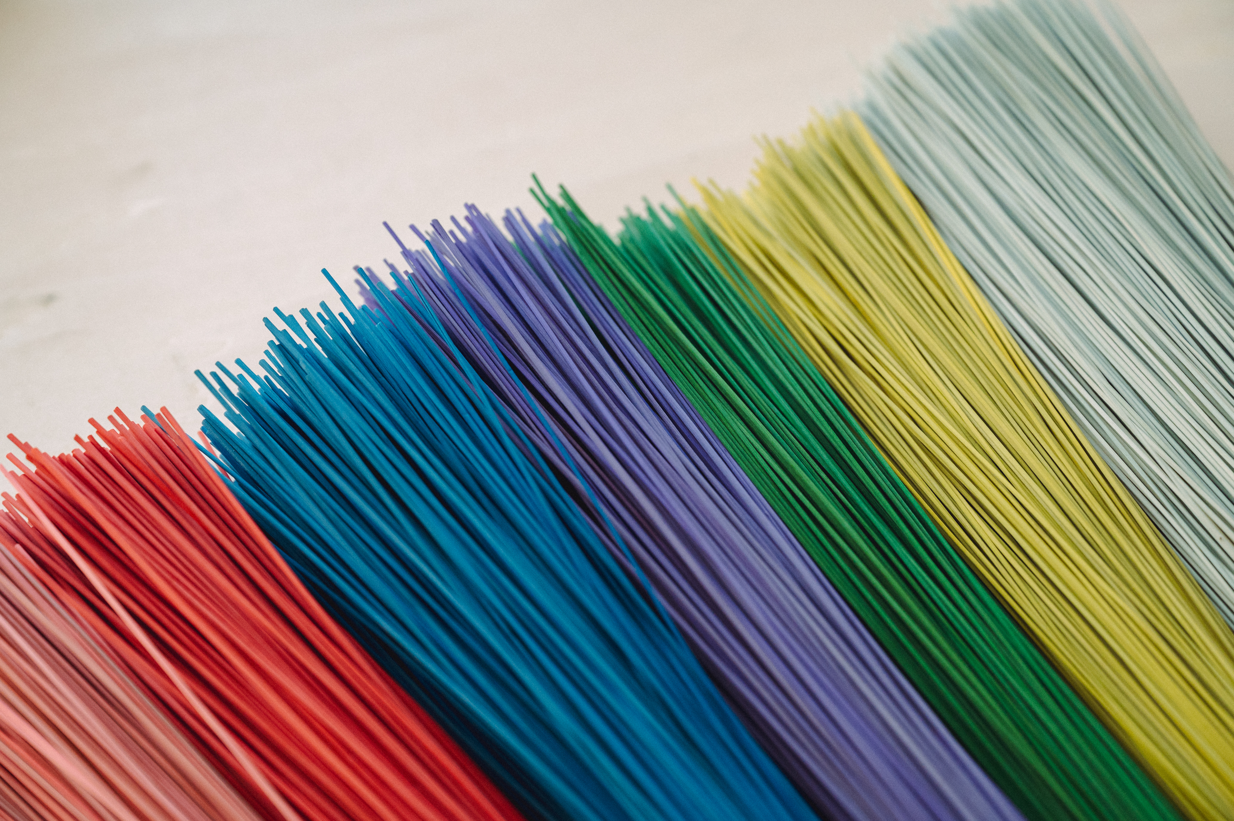 がらんと広い空間で、入り口脇にはイグサの束や、カラフルに染めあげてカットされた原料がいくつも積み重ねられている。