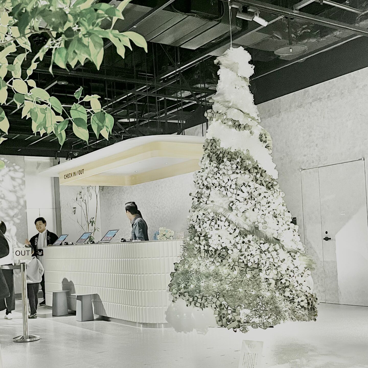 同じ年の冬、この作品をさらに発展させたような、真っ白なイグサをつないだ塊やリングをまとったクリスマスツリーが、「OMO5熊本 by星野リゾート」のカウンター横を飾った。もこもこした質感が、遠目に雪が降り積もっているように見える。このときは公開制作の形をとり、多くの人々が作品に関わるスタイルで制作された。