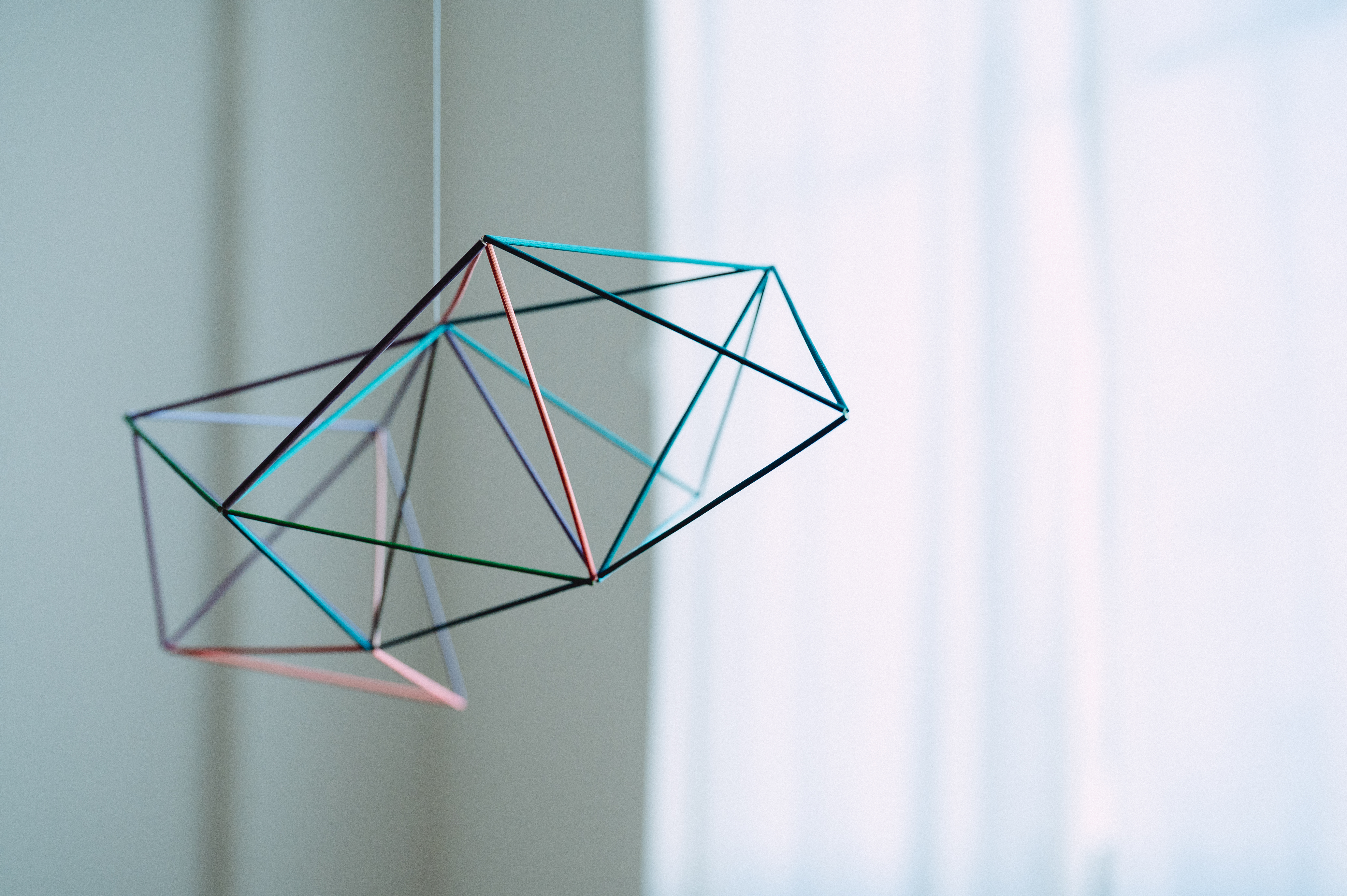 モビールはスポンジ状になっているイグサの芯に糸を通す構造でできている。紙の筒で同じつくり方をすれば、イグサのモビールを巨大にしたインスタレーションができると考えた。はたして、その通り。