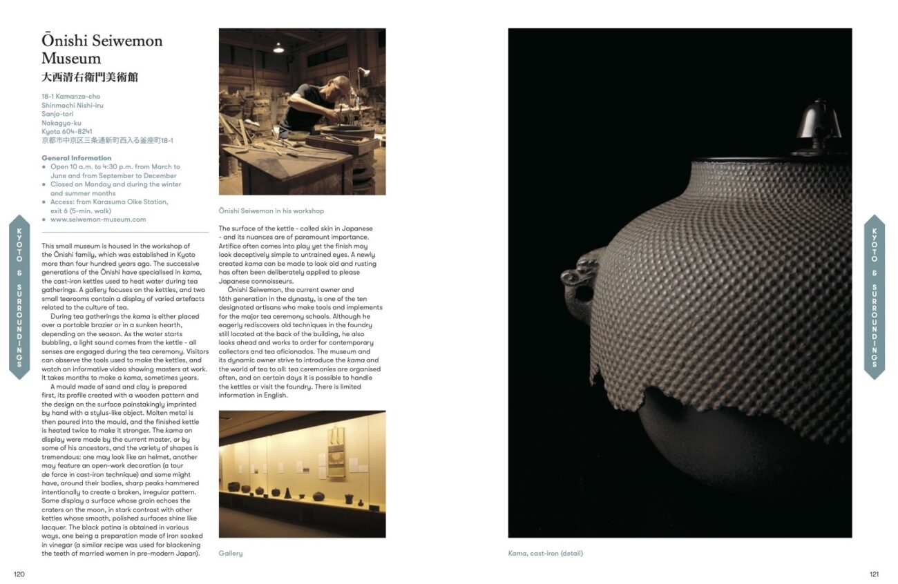 For example, on the pages covering the Kyu Asakura House (Shibuya, Tokyo) she writes: “Once visitors have removed their shoes, they can enter the two-storey wooden building and walk the tatami-covered rooms freely…. Here visitors must sit down on the floor to enjoy the scenery. The apertures, uniting the architecture and the garden, frame ideal views of the trees and showcase the subtle calculated balance between a tended garden and nature left free” (p. 38). Regarding Kawai Kanjiro’s House in Kyoto, she writes: “The [Kawai] family lovingly runs the museum and keeps Kawai’s spirit alive. Visitors are free to sit on chairs and touch the furniture,” her commentary bringing the reader a sense of immediacy as would a reporter doing a live-broadcast. And at the end, it does not fail to add information on the surroundings: “The Kyoto National Museum is a short walk away” (p. 104).